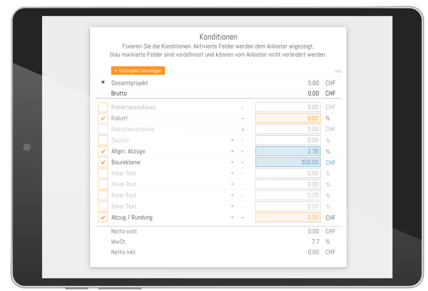 Präzisierung Unklar ausgeschrieben? Erfassen Sie Präzisierungen zum Angebot. Mit der Importfunktion können Sie in aller Ruhe eine Excel-Liste erstellen, um sie letztendlich dem Angebot beizulegen. |