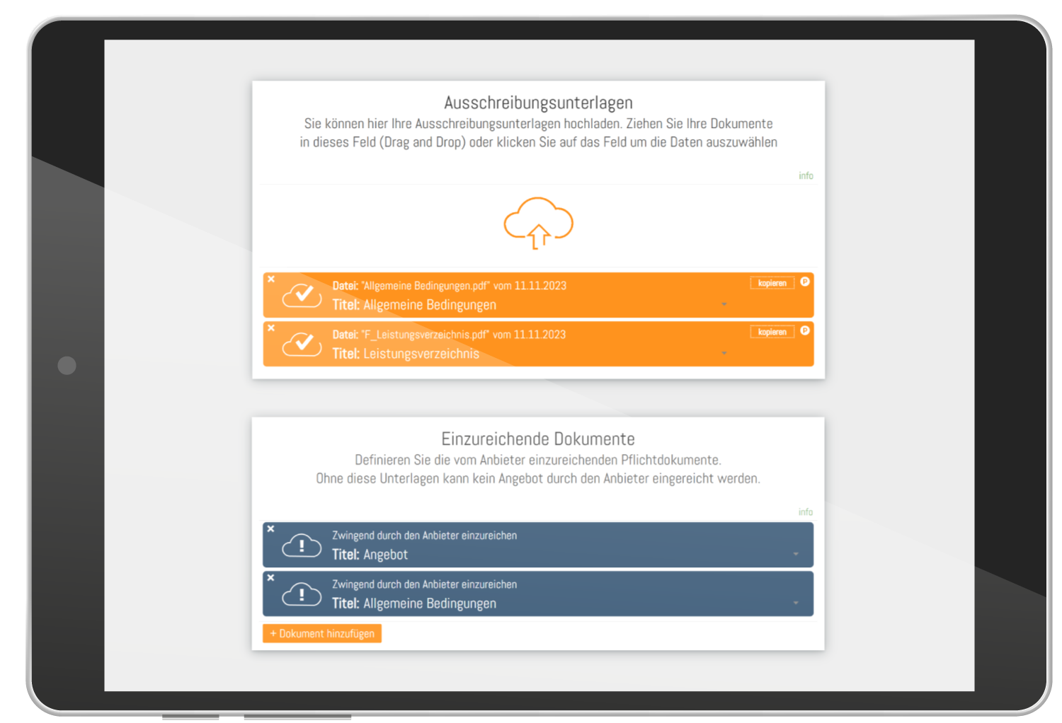Ausschreibung einfach erstellen bausync.ch sieht sich als Ergänzung zu Ihrer lokalen Bauadministration. Erstellen Sie Ihre Leistungsverzeichnisse in Ihrer gewohnten Umgebung und laden Sie diese sowie weitere Dokumente via Drag&Drop hoch, definieren Sie die zwingend einzureichenden Unterlagen. Legen Sie die Konditionen fest und wählen Sie den Anbieter aus dem Schweizer Handelsregister oder publizieren Sie die Submission öffentlich. |