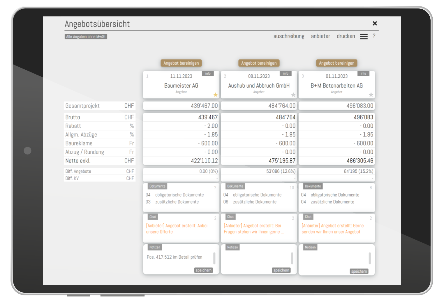 Angebote übersichtlich vergleichen Alle Angaben, Unterlagen, Nachrichten und Präzisierungen werden zusammengefasst und Ihnen übersichtlich präsentiert. Vergleichen Sie in Sekunden die Angebote und prüfen Sie anschliessend alle Details in einer Übersicht. |