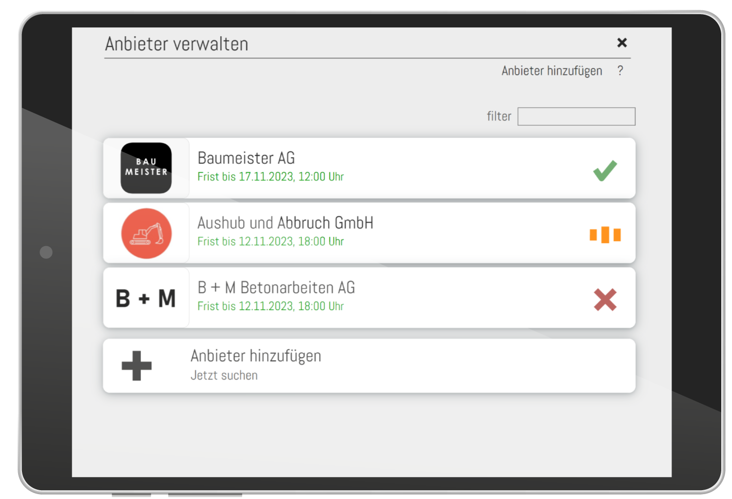 Unternehmerliste führen Sie können gemeinsam mit Ihrem Bauherrn, Architekten, Fachplaner etc. online eine Unternehmerliste erstellen und führen. Ausserdem sehen Sie jederzeit online, ob ein Unternehmen mitrechnet, ein Angebot eingereicht oder abgesagt hat und das über alle Ausschreibungen. |